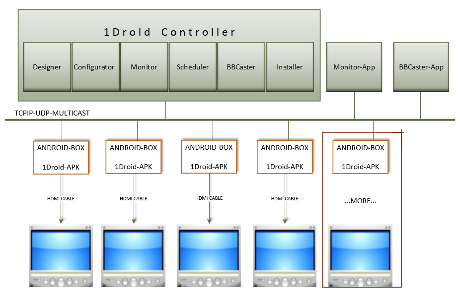 1Droid Framework is a suite of software and hardware components working together to create, manage, manipulate and display graphic designs. At this stage the hardware platform targeted is based on both PC and Android devices. The PC components can run in Windows OS starting at WinXP up to today OS (Windows10...). The windows part of the Framework comprises a Windows Service, and integrated management system (1Droid Controller), a Monitoring tool and a real time Bulletin Board broadcaster. All those components can run as controls in 1DroidController and/or as independent applications.
